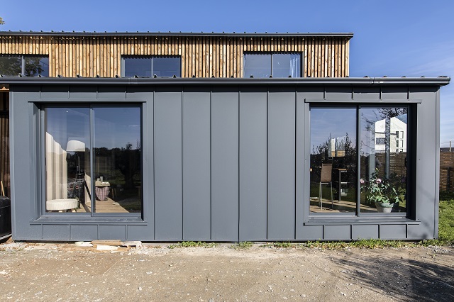 Killian Chastel : Il y a 4 containers sur la partie basse : 3 collés les uns contre les autres où il y a les parties communes : à savoir le salon, la cuisine, 2 chambres, 1 salle de bain et 1 entrée. Et 1 autre container qui, lui, est décalé dans la profondeur et qui servira de garage. Les containers du bas et du haut font 12,5 m. Il y a donc 4 containers en bas et 2 containers en haut dans la largeur. La maison forme alors un gros cube, que ce soit en longueur mais également en largeur. En terme de surface, un container fait 30 m² et nous en avons utilisé 6 au total. La maison terminée, nous comptabilisons aujourd’hui 140 m² de surface habitable. Au niveau du timing, nous avons mis 1 an et demi à la construire, 1 semaine et demie à poser le revêtement de façades Uniso sur le contour de l’habitation et 2 semaines pour faire les habillages des fenêtres.