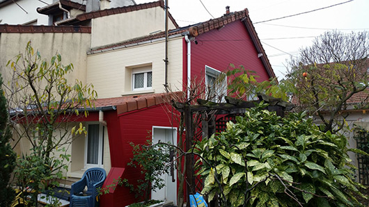 Il y en a deux en particulier dont je suis très fier ! Le premier c’est une maison dont la transformation est très réussie, avec une alliance de rouge et de crème sur les façades ! Il y a un pignon rouge en clin horizontal et le reste en texture bois. Les propriétaires n’ont pas hésité à se démarquer du reste de la rue et ils ont eu raison ! Il y a beaucoup de végétation autour, le cadre est superbe !